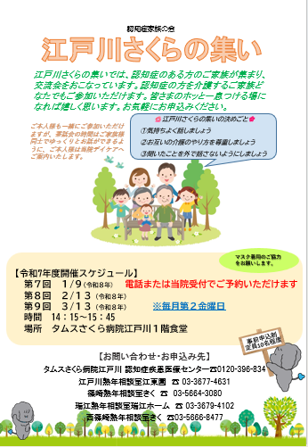 「江戸川さくらの集い」では 、認知症のある方のご家族が集まり、交流会 をおこなっています。