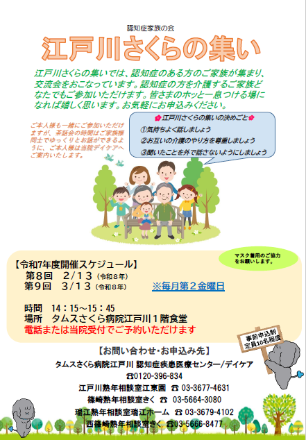 「江戸川さくらの集い」では 、認知症のある方のご家族が集まり、交流会 をおこなっています。